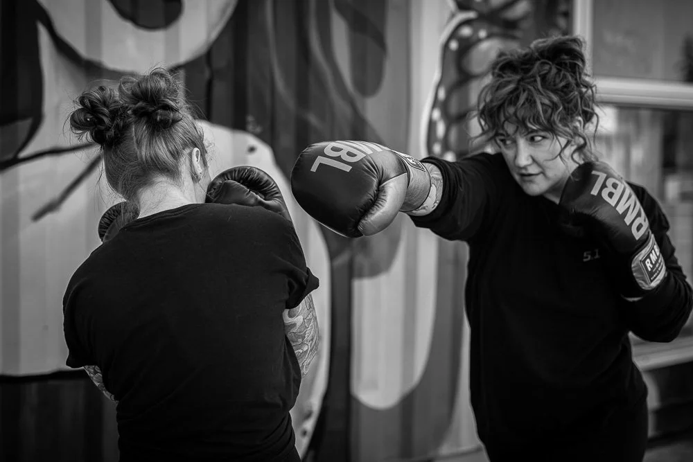Two women in boxing gloves standing in a gym, facing each other in a boxing stance, in front of a mural of a woman's face painted on a wall.
